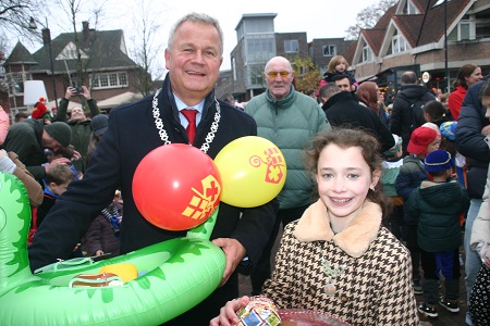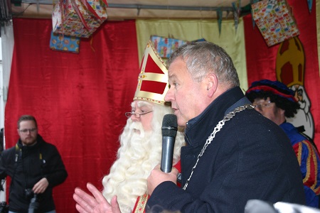 Als het paard van de Sint bij het Kloosterplein komt, loopt de Goed Heiligman naar de gereedstaande wagen. Daar vindt het ontvangst door de echte burgemeester en de kinderburgemeester plaats. Natuurlijk ontvangen ze ook een cadeautje van de Sint. De burgemeester krijgt een zwemband van de Sinterklaas. Hij heeft zich ingespannen om het zwembad voor Goirle te behouden. De kinderburgemeester kan met een strandbal spelen.